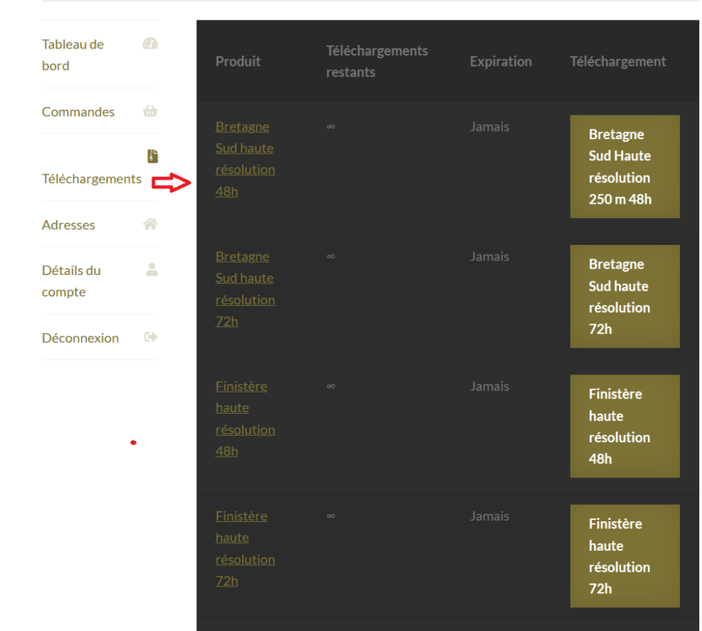 Après finalisation de votre commande vous aurez accès autant de fois que vous le souhaitez à vos fichiers mis à jour tous les jours à 10h UTC dans l’onglet téléchargements. Ainsi chaque jour, connectez vous à votre compte et accédez à vos gribs actualisés via cet onglet